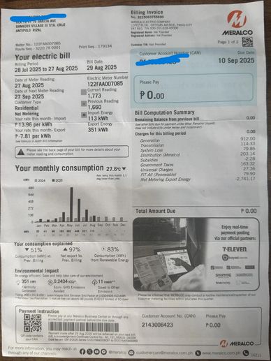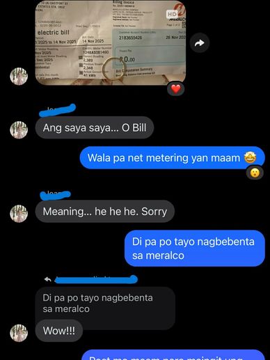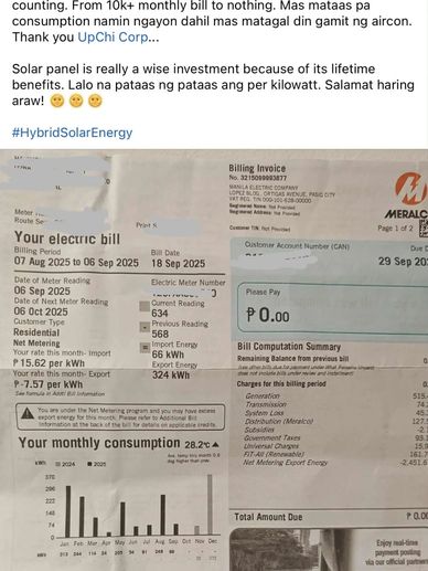 "Nagtake effect na metering on oct bill from ave 4.5k,down to 203. Sales talk kita now sa mga kapatid at friends ko. Salamat sir.Ang ganda ng bill nyo.Grabe liit ng rate ng export as expected tama formula ko.